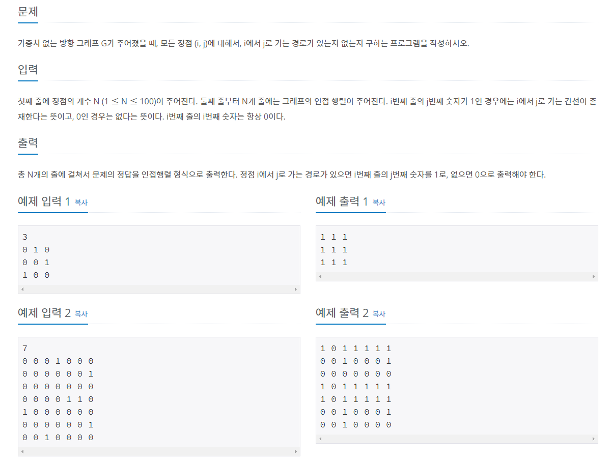 가중치 없는 방향 그래프 G가 주어졌을 때, 모든 정점 (i, j)에 대해서, i에서 j로 가는 경로가 있는지 없는지 구하는 프로그램을 작성하시오.