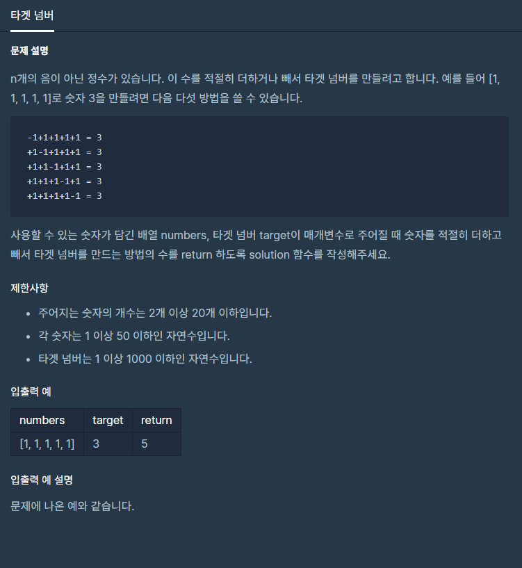 n개의 음이 아닌 정수가 있습니다. 이 수를 적절히 더하거나 빼서 타겟 넘버를 만들려고 합니다. 예를 들어 [1, 1, 1, 1, 1]로 숫자 3을 만들려면 다음 다섯 방법을 쓸 수 있습니다. -1+1+1+1+1 = 3 +1-1+1+1+