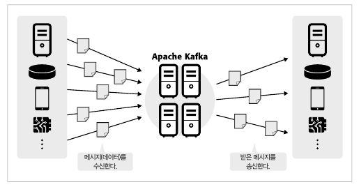 - 여러대의 분산 서버에서 대량의 데이터를 처리하는 분산 메시징 시스템으로 메시지를 받고, 받은 메시지를 다른 시스템이나 장치에 보내기 위해 사용.