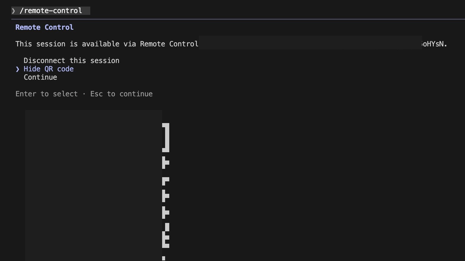 다시 한번 /remote-control 입력하고 2번째 항목의 Show QR code을 출력하면 QR 코드가 노출된다.