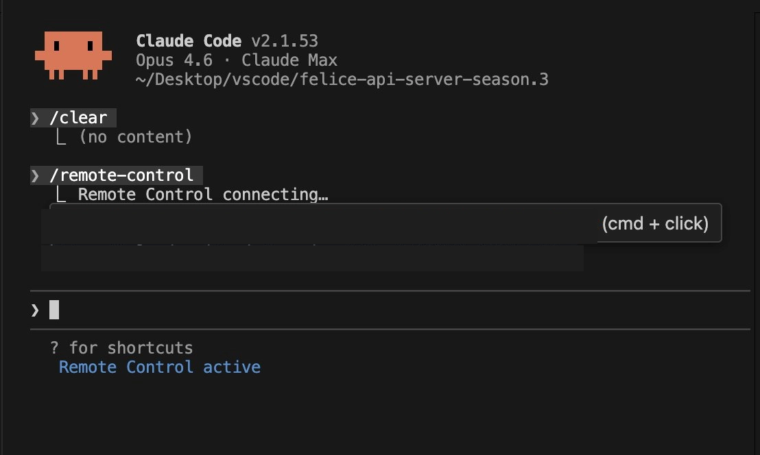 /remote-control을 통해 연결하면 연결주소와 입력창 하단에 Remote control active 상태가 표시된다.
