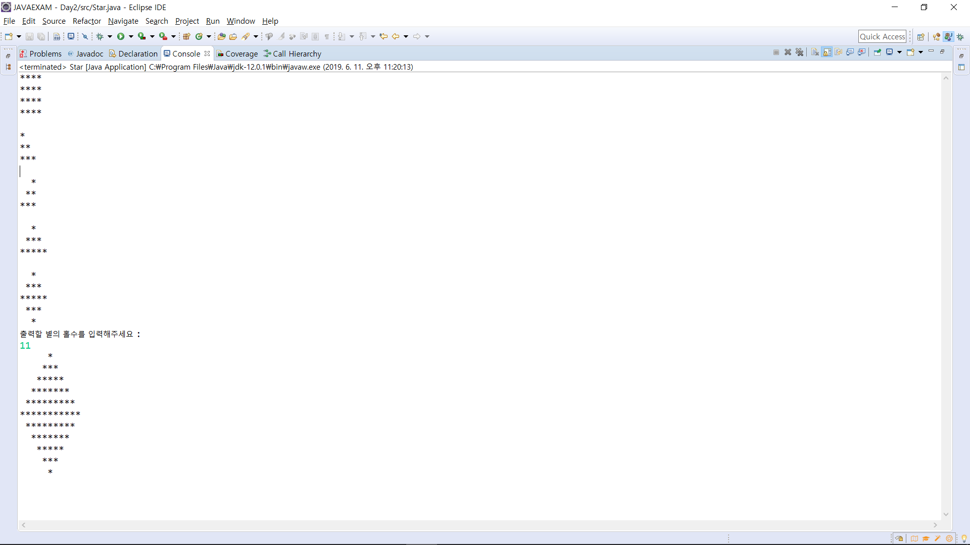 1 2 3 4 5 6 7 8 9 10 11 12 13 14 15 16 17 18 19 20 21 22 23 24 25 26 27 28 29 30 31 32 33 34 35 36 37 38 39 40 41 42 43 44 45 46 47 48 49 50 51 52 53 54 55 56 57 58 59 60 61 62 63 64 65 66 67 68 69 70 71 72 73 74 75 76 77 78 79 80 81 82 83 84 85 86 87 88 89 90 91 92 93 94 95 96 97 98 99 100 101 102 103 104 105 106 | import java.util.Scanner; public class Star { public static void main(String[] args) { int i =1 ; //1번 while ( i<=4 ) { int j =1 ; while ( j<=4 ) { System.out.print("*"); j++; } i++; System.out.println(); } System.out.println(); //2번 for (i=1; i<=3; i++) { for (int j=1; j<=i; j++){ System.out.print("*"); } System.out.println(" "); } System.out.println(); //3번 for (i=3; i>0; i--) { for (int j=1; j<=3 ; j++){ if(j>=i) { System.out.print("*"); } else{ System.out.print(" "); } } System.out.println(); } System.out.println(); // 4번 // 3번을 활용하려 했으나 조건값이 달라서 활용불가 int a, b; for(i = 0; i < 15; i++) { //공간의 크기(15)만큼 반복 a = i/5;// 몫 b = i%5;//나머지 if(b < 2-a || 2+a < b) { // 2-몫이 나머지 보다 크거나 2+몫이 나머지보다 작으면 " "을 출력 System.out.print(" "); }else { System.out.print("*"); } if(b == 4)System.out.println(""); // 5회 반볶시 줄바꿈 } System.out.println(""); //5번 for(i=0; i < 25; i++) { //공간의 크기(25)만큼 반복 if(i/5 <= 2) { a = i/5; // 몫에 대칭성을 주기위한 조건문 }else { a = 4-i/5; } b = i%5; //나머지 if(b < 2-a || 2+a <b) { //위와 동일 System.out.print(" "); }else { System.out.print("*"); } if(b ==4) { System.out.println(""); //5회 반복마다 줄바꿈 } } //6번 입력받는 홀수줄 만큼의 별 그리 //scaner 사용 홀수의 수를 받는다 int size ; Scanner sc= new Scanner(System.in); //스캐너 사용 System.out.println("출력할 별의 홀수를 입력해주세요 : "); size = sc.nextInt(); // size에 입력받음 for( i = 0; i<size*size; i++) { b = i%size; // 나머지 if(i/size <= (size-1)/2){ //몫을 대칭구조로 구함 a = i/size; }else { a = (size-1)- i/size; } if((size-1)/2-a > b || (size-1)/2+a <b) { //위와 같은 출력 몫과 나머지의 크기를 중앙값으로 구분 System.out.print(" "); }else { System.out.print("*"); } if(b == size - 1)System.out.println(""); } } } | cs |