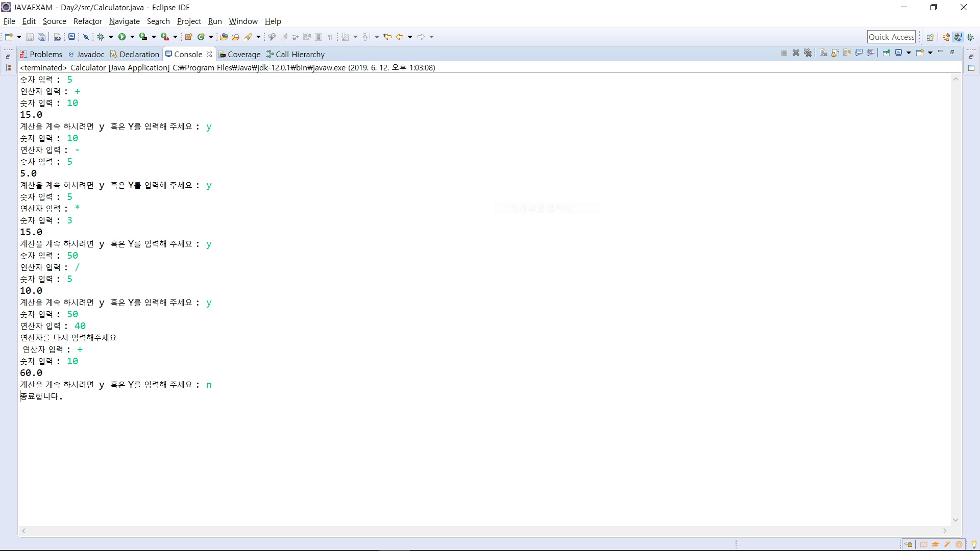 계산기를 실행 시킨 화면. 잘못된 연산자 입력시 다시 실행