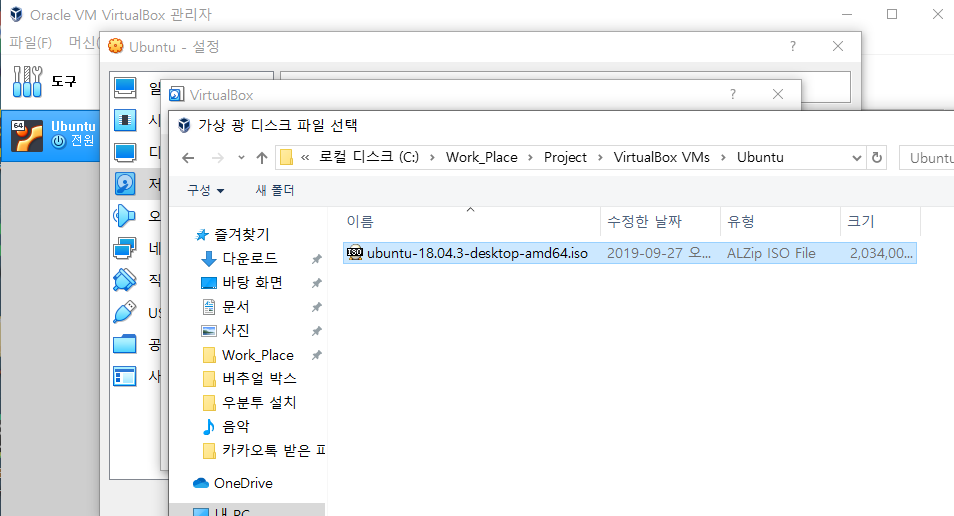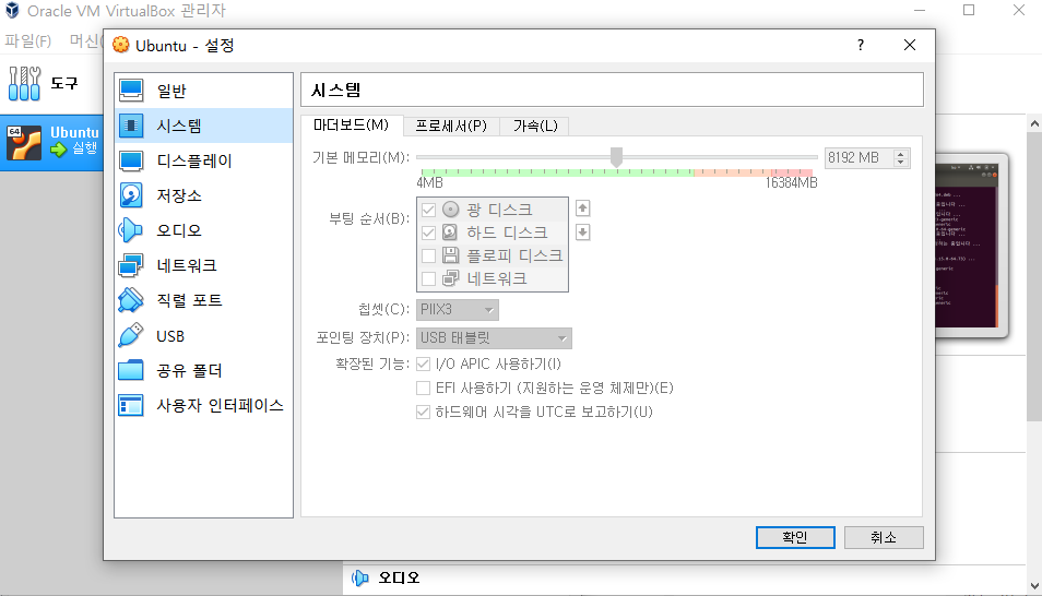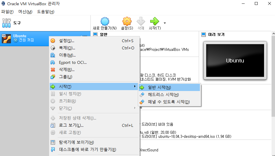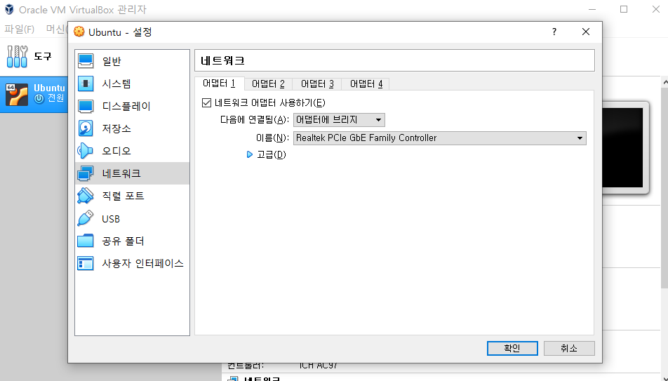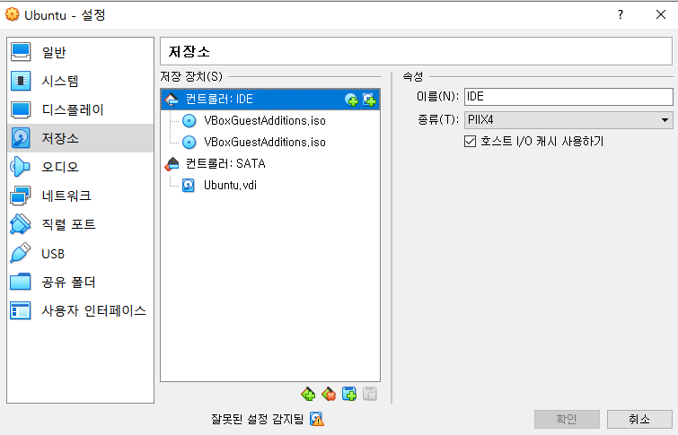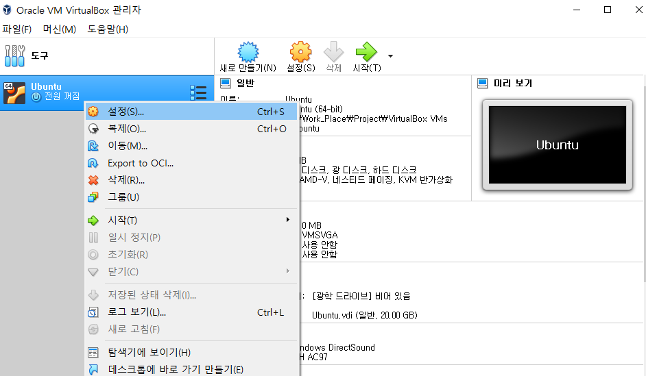 VirtualBox를 실행 시킨후 앞선 글에서 만들었던 Ubuntu가상환경의 설정을 클릭.