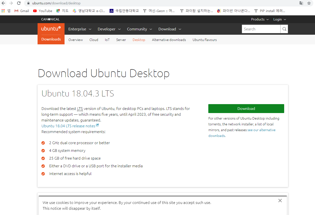 https://ubuntu.com/download/desktop 링크를 통해 Ubuntu 홈페이지에서 다운로드를 받아주세요.