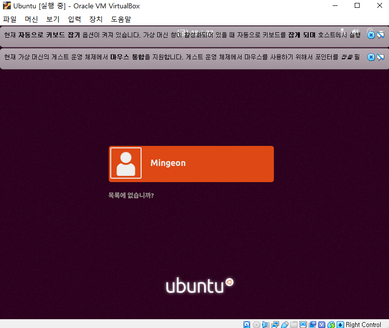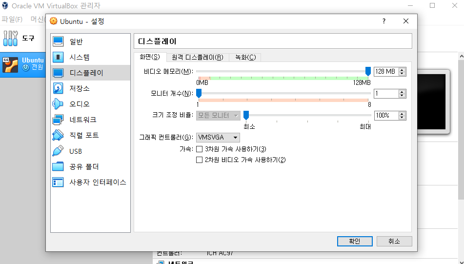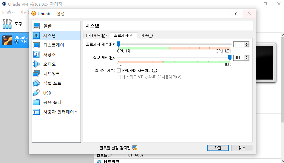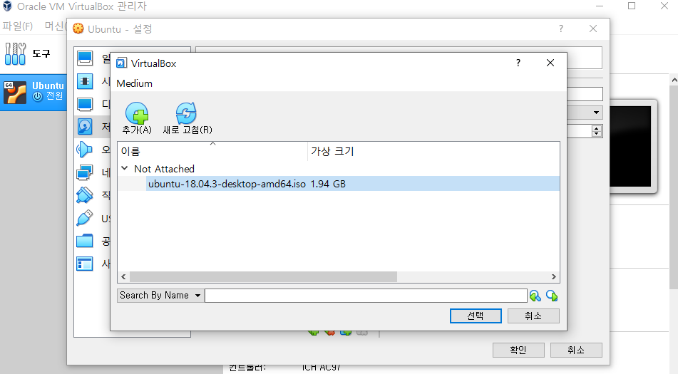 VirtualBox를 실행 시킨후 앞선 글에서 만들었던 Ubuntu가상환경의 설정을 클릭.