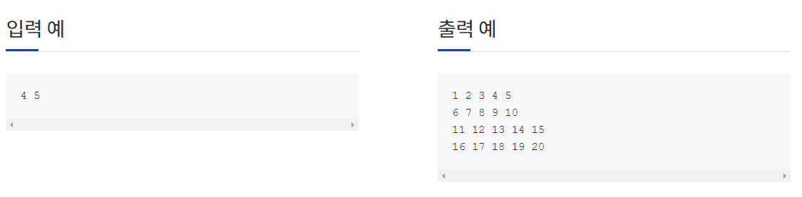 n행 m열의 사각형 형태로 1부터 n*m번까지 숫자가 차례대로 출력되는 프로그램을 작성하시오.