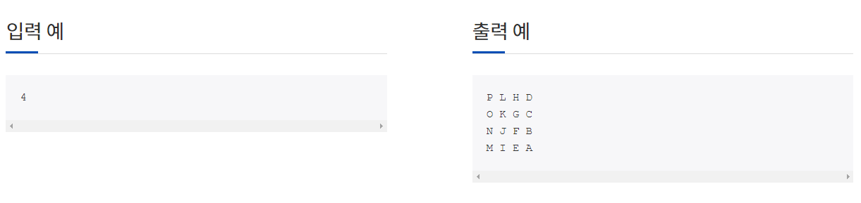 정사각형의 한 변의 길이 n을 입력받은 후 다음과 같은 문자로 된 정사각형 형태로 출력하는 프로그램을 작성하시오. < 처리조건 > 문자의 진행 순서는 맨 오른쪽 아래에서 위쪽으로 'A'부터 차례대로 채워나가는 방법으로 아래 표와 같이 왼쪽 위까지 채워 넣는다. 'Z' 다음에는 다시 'A'부터 반복된다. 정사각형 한 변의 길이 n(n의 범위는 1이상 100 이하의 정수)을 입력받는다. 위의 형식과 같이 한변의 길이가 n인 문자 사각형을 출력한다. 문자 사