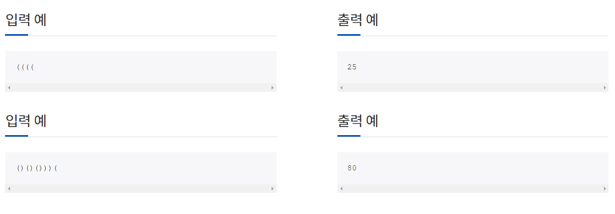 입력파일의 첫 줄에는 괄호문자로만 이루어진 문자열이 주어진다. 입력 문자열에서 열린 괄호 ‘(’은 바로 놓인 그릇 닫힌 괄호 ‘)’은 거꾸로 놓인 그릇을 나타난다. 문자열의 길이는 3이상 50 이하이다.