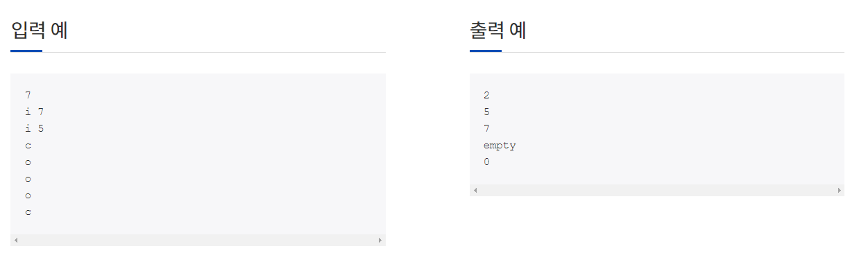 2. "o"는 스택에서 데이터를 빼고, 그 데이터를 출력한다. 만약 스택이 비어있으면, "empty"를 출력한다.