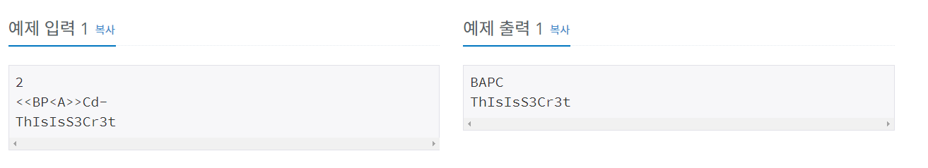 문제 창영이는 강산이의 비밀번호를 훔치기 위해서 강산이가 사용하는 컴퓨터에 키로거를 설치했다. 며칠을 기다린 끝에 창영이는 강산이가 비밀번호 창에 입력하는 글자를 얻어냈다. 키로거는 사용자가 키보드를 누른 명령을 모두 기록한다. 따라서, 강산이가 비밀번호를 입력할 때, 화살표나 백스페이스를 입력해도 정확한 비밀번호를 알아낼 수 있다. 강산이가 비밀번호 창에서 입력한 키가 주어졌을 때, 강산이의 비밀번호를 알아내는 프로그램을 작성하시오. 입력 첫째 줄에 테