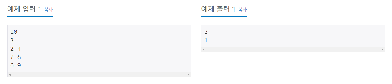 첫째 줄에 롤 케이크의 길이 L (1 ≤ L ≤ 1000)이 주어진다. 둘째 줄에는 방청객의 수 N (1 ≤ N ≤ 1000)이 주어진다. 다음 N개 줄에는 각 방청객 i가 종이에 적어낸 숫자 Pi와 Ki가 주어진다. (1 ≤ Pi ≤ Ki ≤ L, i = 1..N)