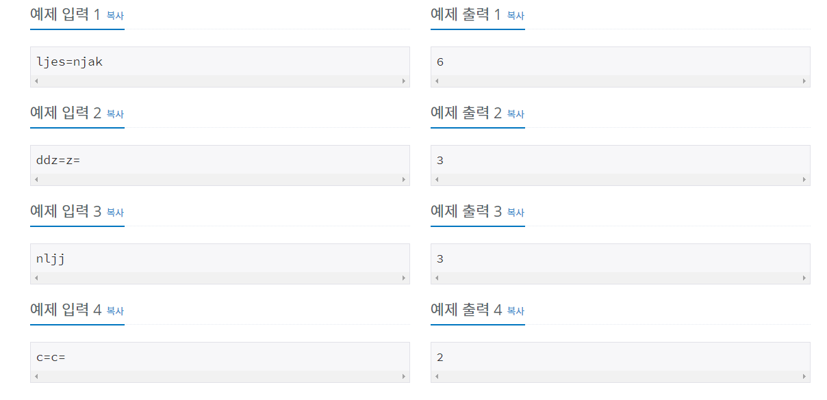 문제 예전에는 운영체제에서 크로아티아 알파벳을 입력할 수가 없었다. 따라서, 다음과 같이 크로아티아 알파벳을 변경해서 입력했다. 크로아티아 알파벳 변경 č c= ć c- dž dz= đ d- lj lj nj nj š s= ž z= 예를 들어, ljes=njak은 크로아티아 알파벳 6개(lj, e, š, nj, a, k)로 이루어져 있다. 단어가 주어졌을 때, 몇 개의 크로아티아 알파벳으로 이루어져 있는지 출력한다. dž는 무조건 하나의 알파벳으로 쓰이고,