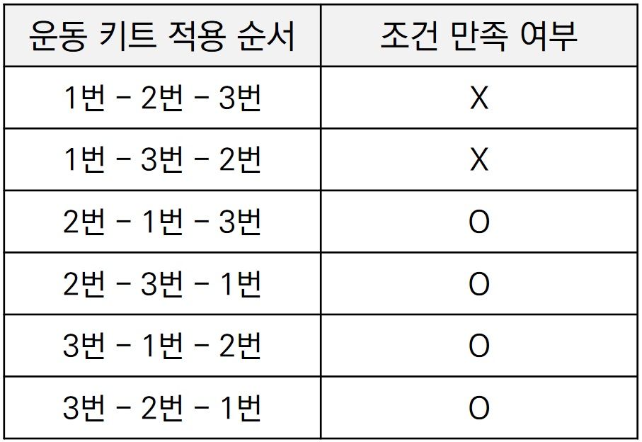 반면에 3번, 1번, 2번 순서대로 운동 키트를 적용한다고 해보자. 그러면 1일차부터 운동을 모두 마친 날까지의 모든 시점에 대하여 항상 중량이 500이상이 된다.