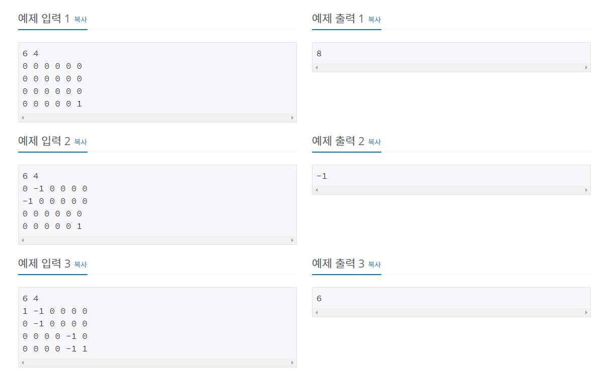 여러분은 토마토가 모두 익을 때까지의 최소 날짜를 출력해야 한다. 만약, 저장될 때부터 모든 토마토가 익어있는 상태이면 0을 출력해야 하고, 토마토가 모두 익지는 못하는 상황이면 -1을 출력해야 한다.